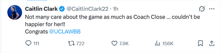 That phrase about Coach Close hits home because Clark understands how rare it is to see someone as passionate about the game as UCLA's seasoned coach. For supporters, this message feels like a modest passing-of-the-torch moment from one of the sport's top stars to the staff that recently delivered UCLA's first NCAA title.