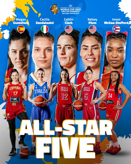 Caitlin Clark (USA) took MVP honors, while Megan Gustafson, Cecilia Zandalasini, Caitlin Clark, Kelsey Plum, Imani McGee-Stafford was the FIBA Women’s Basketball World Cup 2026 Qualifying Tournaments All-Star Five.