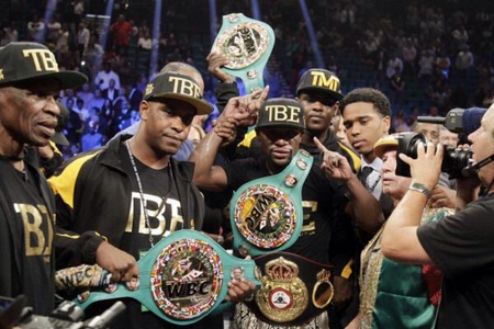 On May 2 at the MGM Grand Garden Arena, Mayweather (47-0) defeated Pacquiao (57-5-2) by unanimous decision, 116-112 (x2), 118-110, to win the WBC and WBO welterweight titles.