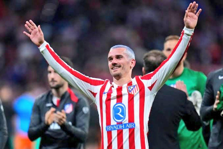 The graphic portrays Griezmann in Atletico's red-and-white uniform, gloating over a downed Barcelona player on a buzzing stadium pitch—appropriate shade following Barça's 4-0 first-leg defeat, but no qualification for the Clásico players. Griezmann, with his goal contributions in the tie, personifies Atleti's tenacity as they advance to the final.