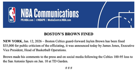 The NBA fined Boston Celtics player Jaylen Brown $35,000 for verbally criticizing the referees following his team's 100-95 loss to the San Antonio Spurs. Despite scoring 27 points on 28 shots with no free throws, Brown criticized the officiating as "terrible" and cited inconsistent calls that favored the Spurs (20).