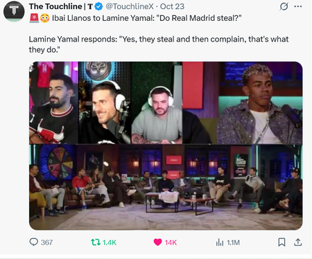 According to The Touchline (@TouchlineX), Barcelona’s young star Lamine Yamal has stirred up controversy ahead of El Clásico by accusing Real Madrid of “stealing and complaining.” The 18-year-old made the comments during a chat with streamer Ibai Llanos, suggesting that Real Madrid benefits from unfair refereeing while complaining about decisions.